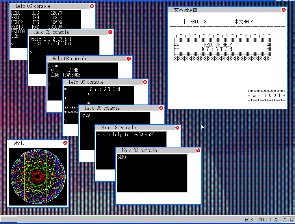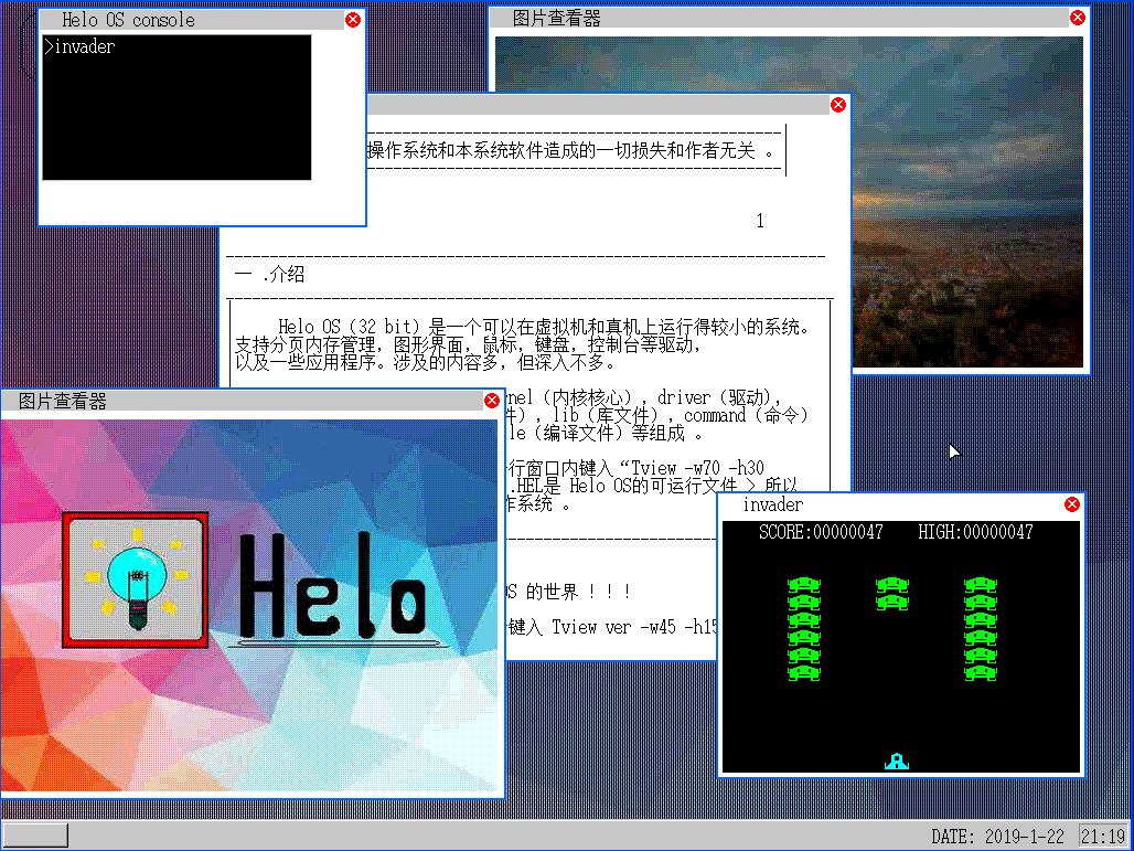 HELO OS是由一个初中生彭泽凯跟据川合秀实先生的纸娃娃操作系统和《30天自制操作系统》写的一个小型的 32 位软盘内核操作系统,支持分页内存管理,图形界面,鼠标,键盘,控制台等驱动,以及一些应用程序。涉及的内容多,但深入不多。系统拥有独立的内核和独立的可执行程序,其可执行文件拓展名为 .HEL 。 Helo OS 的最大特点就是小 ,内核 HELO.SYS 只有 44.8K ,其大小一张软盘就容得下。 启动快速迅捷,秒开。 注意,支持中文显示。 独立内核,独立运行程序 。图形化界面,界面友好,且有时间,壁纸,窗口,应用程序等