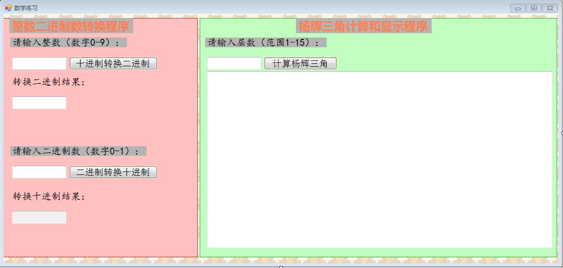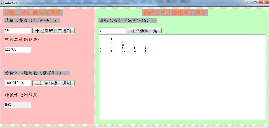 可以实现二进制和十进制转换,杨辉三角显示,别看程序小,可以规避很多输入错误,算法也算可以,适合学生用。