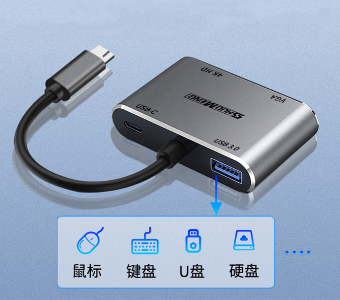 硕盟SM-T54是一款USB-C 扩展坞,您可以将含有USB 3.1协议的电脑主机,通过此产品连接到具有HDMI或VGA的显示器、电视机或其他显示设备。产品可以接入硬盘、U盘、鼠标、键盘和光驱等HDMI或VGA设备。 另外,此产品还可以通过USB-C接口给电脑主机进行充电。