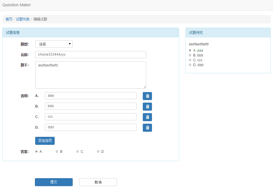 ####项目概述: QuestionMaker可以用来编辑试题(选择题、填空题)和试卷,然后把题目添加到试卷中,从而生成一份调查问卷,类似调查派。 demo